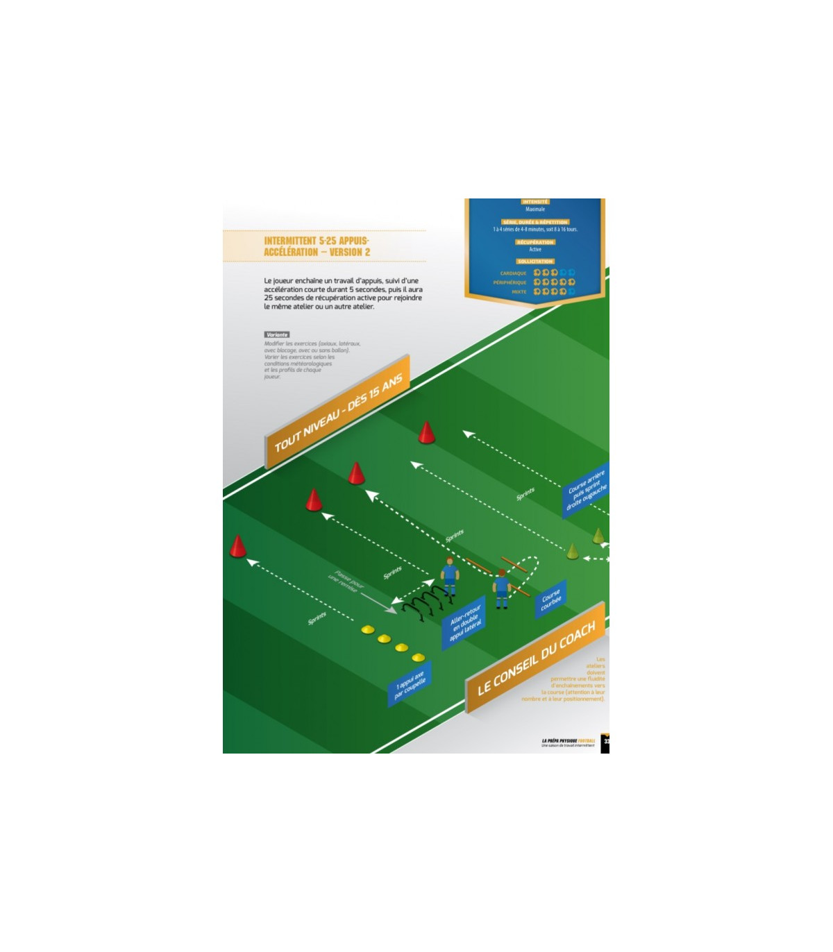 Bien que le football ne soit pas qu’une activité athlétique, le staff technique doit essayer de proposer différentes formes d’exercices intermittents : avec ou sans ballon, pour l’ensemble du groupe ou pour un groupe de joueurs restreint, spécifique au poste, incluant de la motricité, en phase de réathlétisation,en pré-saison...
