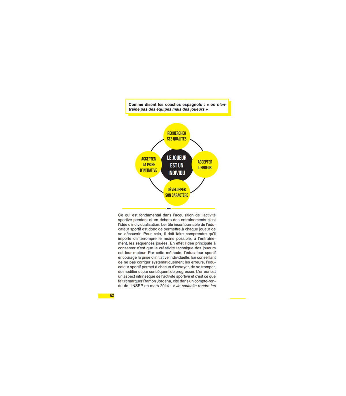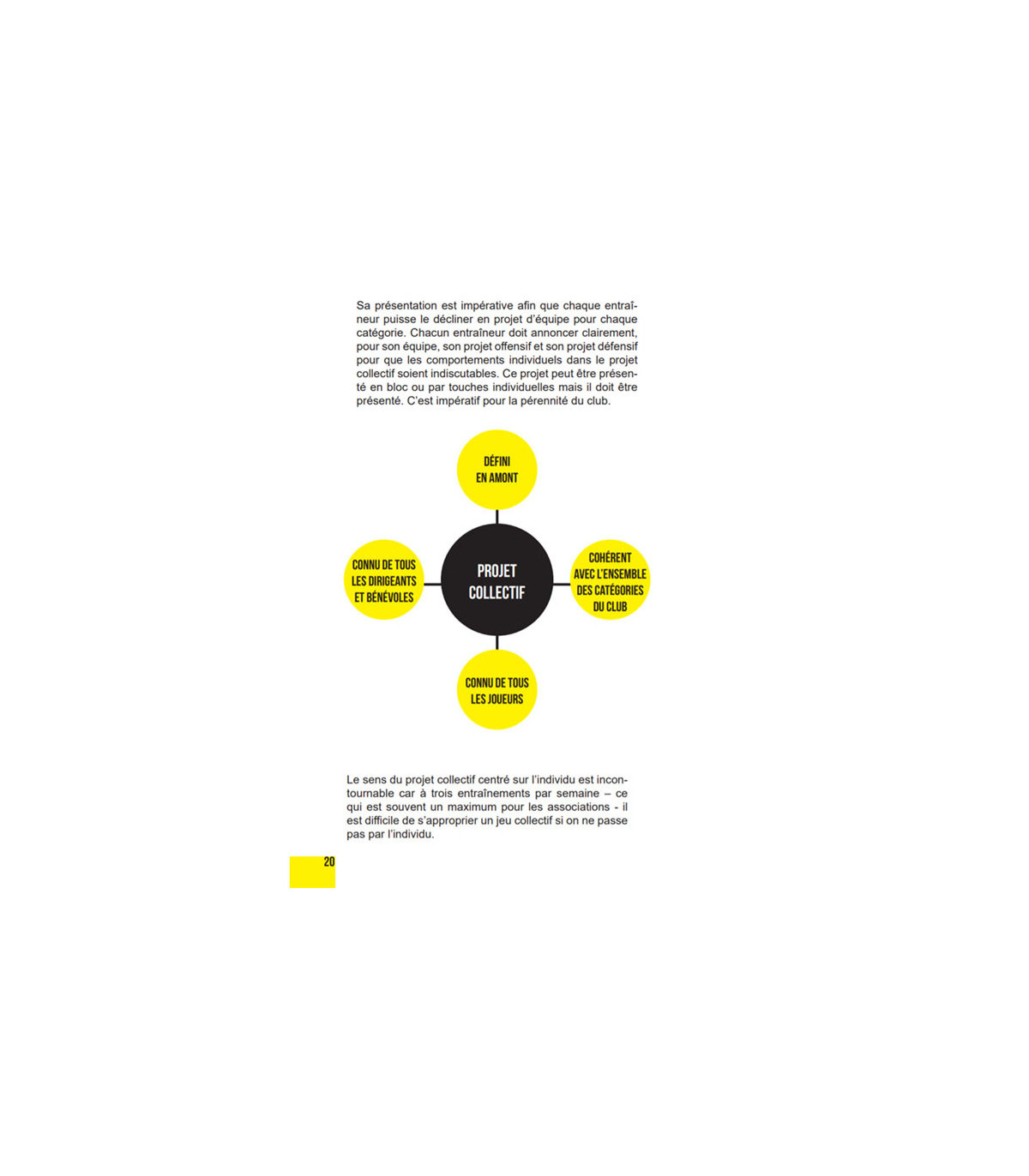 Se centrer sur l’individu est primordial et les auteurs démontrent que la fonction première du projet collectif doit être centrée sur l’individu celui-ci étant au service du groupe. La fonction de l’éducateur sportif est particulièrement importante car c’est lui qui va aider à donner une vraie identité au club. En mixant sa capacité d’écoute et son rôle d’intervenant indispensable et incontournable, l’éducateur sportif est le garant des décisions prises par les dirigeants.